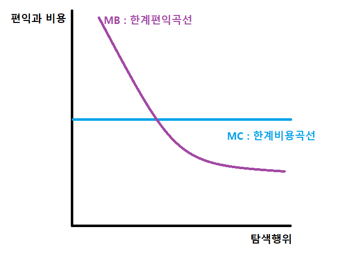 그래서 우리는 정보 탐색행위를 할때 한번에 탐색에 필요한 비용과 한번에 탐색을 통해 얻을 수 있는 이익을 구합니다. 이런 행위를 한계비용과 한계 편익이라고합니다.