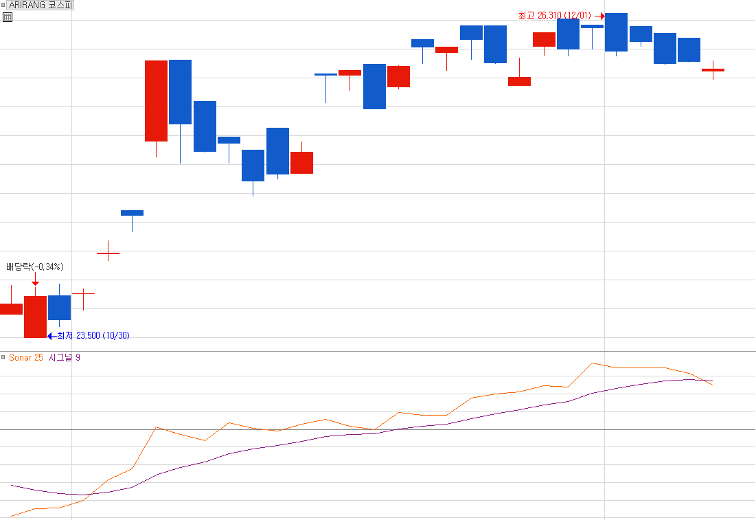주가 사이클의 전환점을 파악하는 유용한 지표입니다. Sonar Momentum은 일본 노무라 증권의 오카모도가 개발한 지표입니다. PSAR지표처럼 주가의 전환점을 파악하는데 용이합니다. 계산방법은 다음과 같습니다.