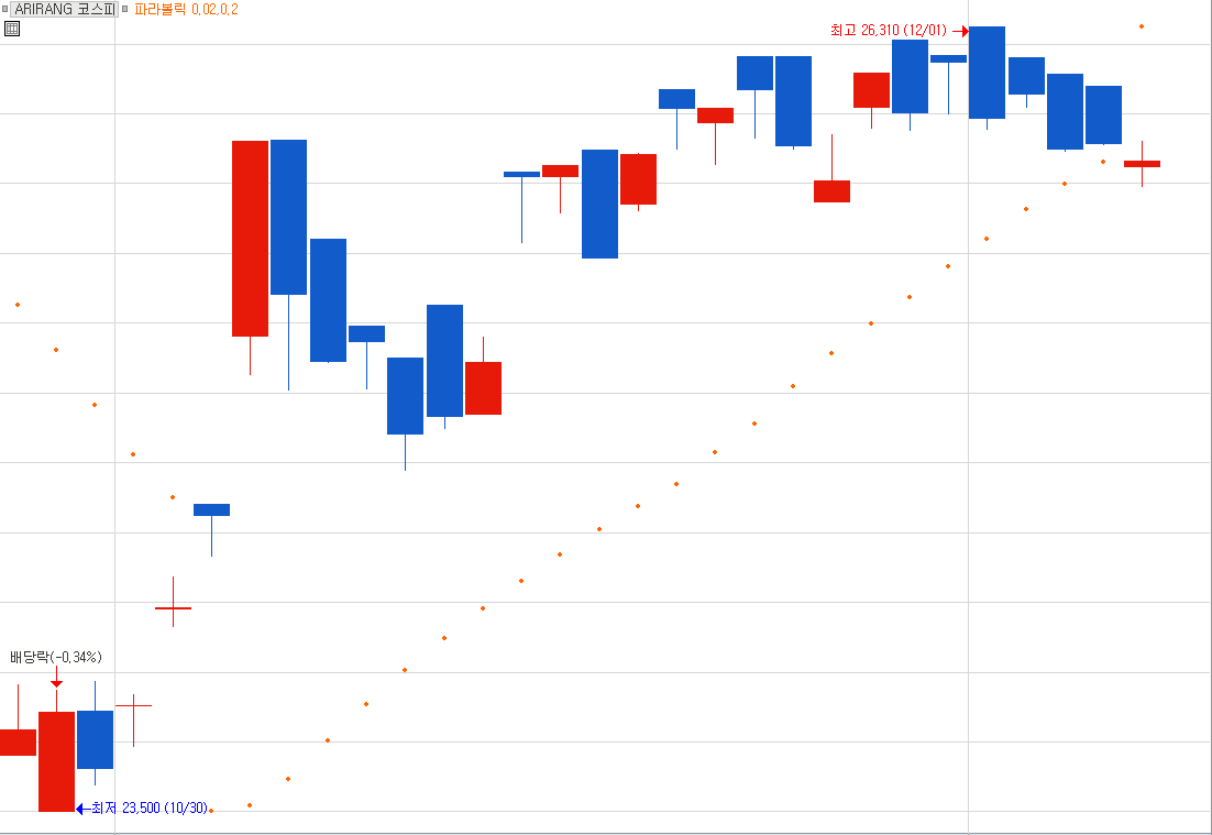PSAR (Parabolic Stop And Reversal)은 상승방향이 진행중이라면 현재, 전날, 전전날 중 가장낮은 값이 새 PSAR이 되고, 하락방향으로 진행중이라면 현재, 전날, 전전날 중 가장 높은값이 새 PSAR이 됩니다. 추세 반전이 되면 이전 추세의 EP(극단점)이 새로운 PSAR이됩니다.