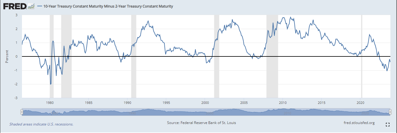 채권은 미리 주식보다 선행합니다. 그리고 그중에 경기침체를 예상할 수 있는 선행지표가 있습니다. 그게 바로 10년물 2년물 장단기 금리차 지수(10-Year Treasury Constant Maturity Minus 2-Year Treasury Constant Maturity (T10Y2Y))입니다. 선행지표인 10Y-2Y지수로 보았을때 이미 역전이 일어나서 경기침체가 예상됩니다. 하지만 늘 맞는 것은 아닙니다. 하지만 지표로서 유용한이유는 대부분 들어 맞았기 때문입니다. 그래서 주식시장도 상승후 조정시기에 조금 큰조정이 이루어지거나 상승후 내려갈때 크게 내려가는 하락 반전이 일어날 수도 있습니다.