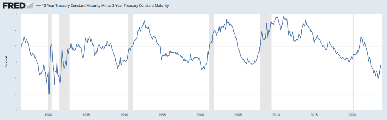 채권은 미리 주식보다 선행합니다. 그리고 그중에 경기침체를 예상할 수 있는 선행지표가 있습니다. 그게 바로 10년물 2년물 장단기 금리차 지수(10-Year Treasury Constant Maturity Minus 2-Year Treasury Constant Maturity (T10Y2Y))입니다.