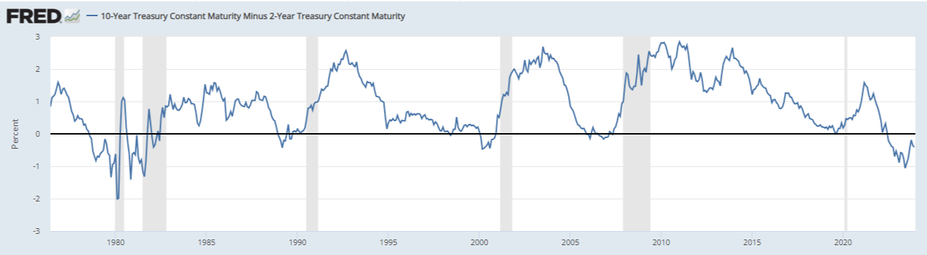 채권은 미리 주식보다 선행합니다. 그리고 그중에 경기침체를 예상할 수 있는 선행지표가 있습니다. 그게 바로 10년물 2년물 장단기 금리차 지수(10-Year Treasury Constant Maturity Minus 2-Year Treasury Constant Maturity (T10Y2Y))입니다.