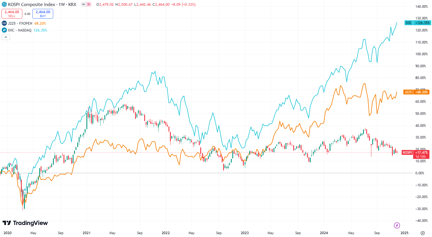 위 사진으로 알 수 있는 것은 미국(하늘), 일본(노랑), 한국(캔들)이고 5년 기준으로 보았을때 한국은 +17.47%것에 반해